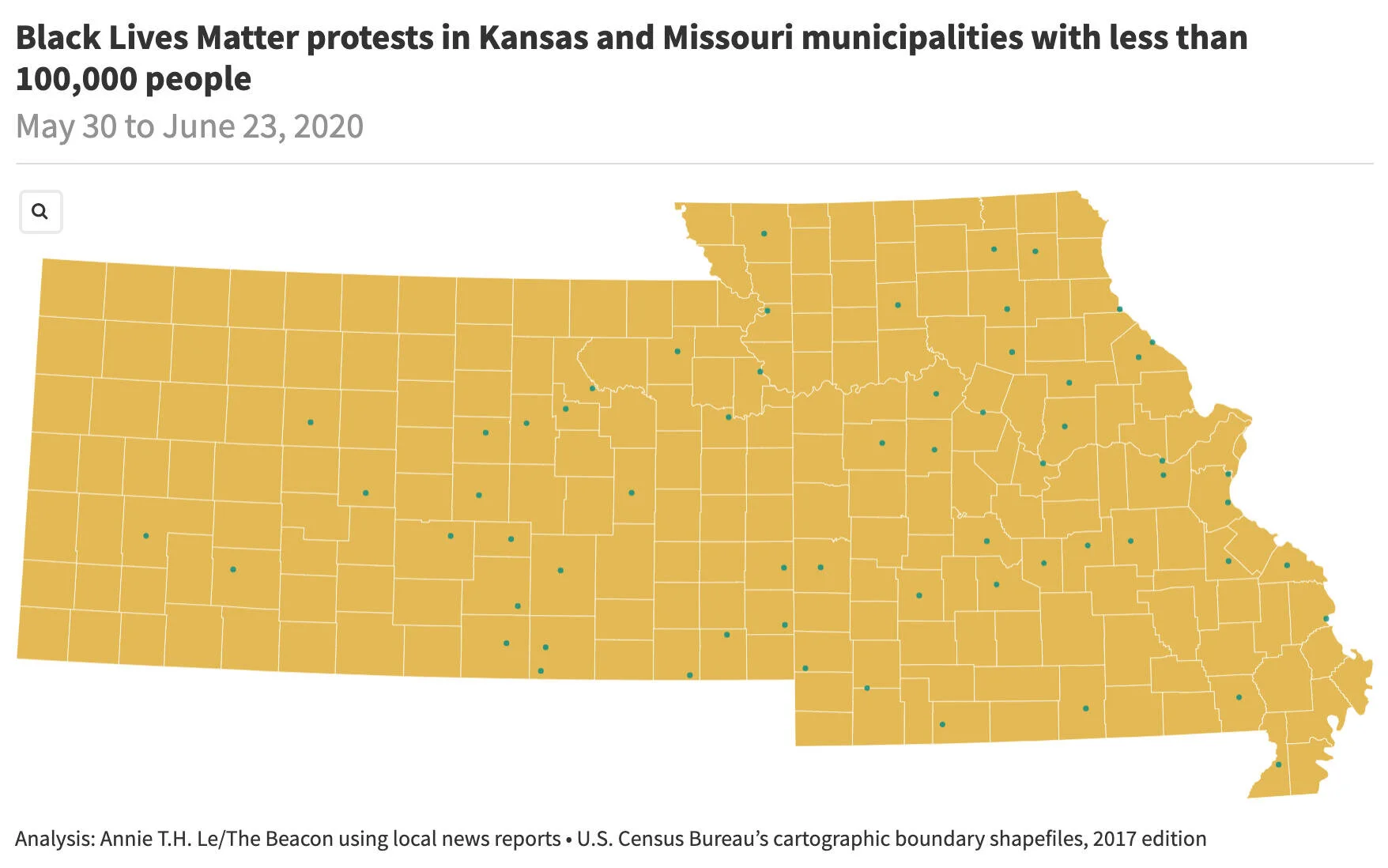 An analysis by The Beacon shows that more than 50 small and mid-sized towns across Kansas and Missouri have held protests since late May. The Beacon defined these as localities with a population under 100,000, excluding the suburbs of Kansas City and St. Louis, and focusing on areas that aren’t part typically part of larger metropolitans. Many of these areas tend to be predominately white with little to no history of protesting in recent years.